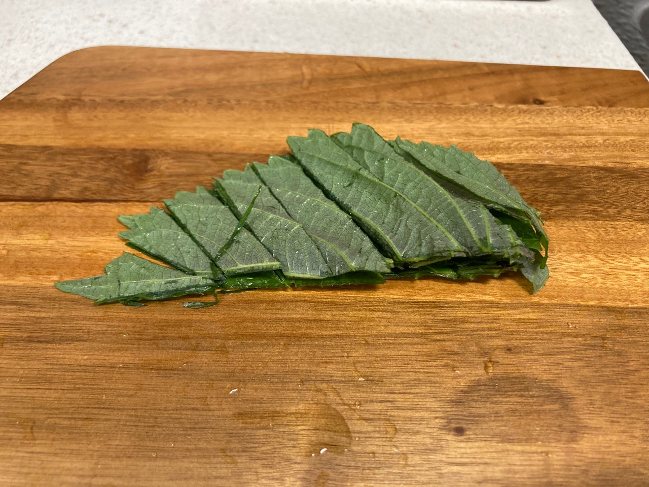 썰어둔 깻잎 숨이 조금 죽을 정도로 함께 볶아주고